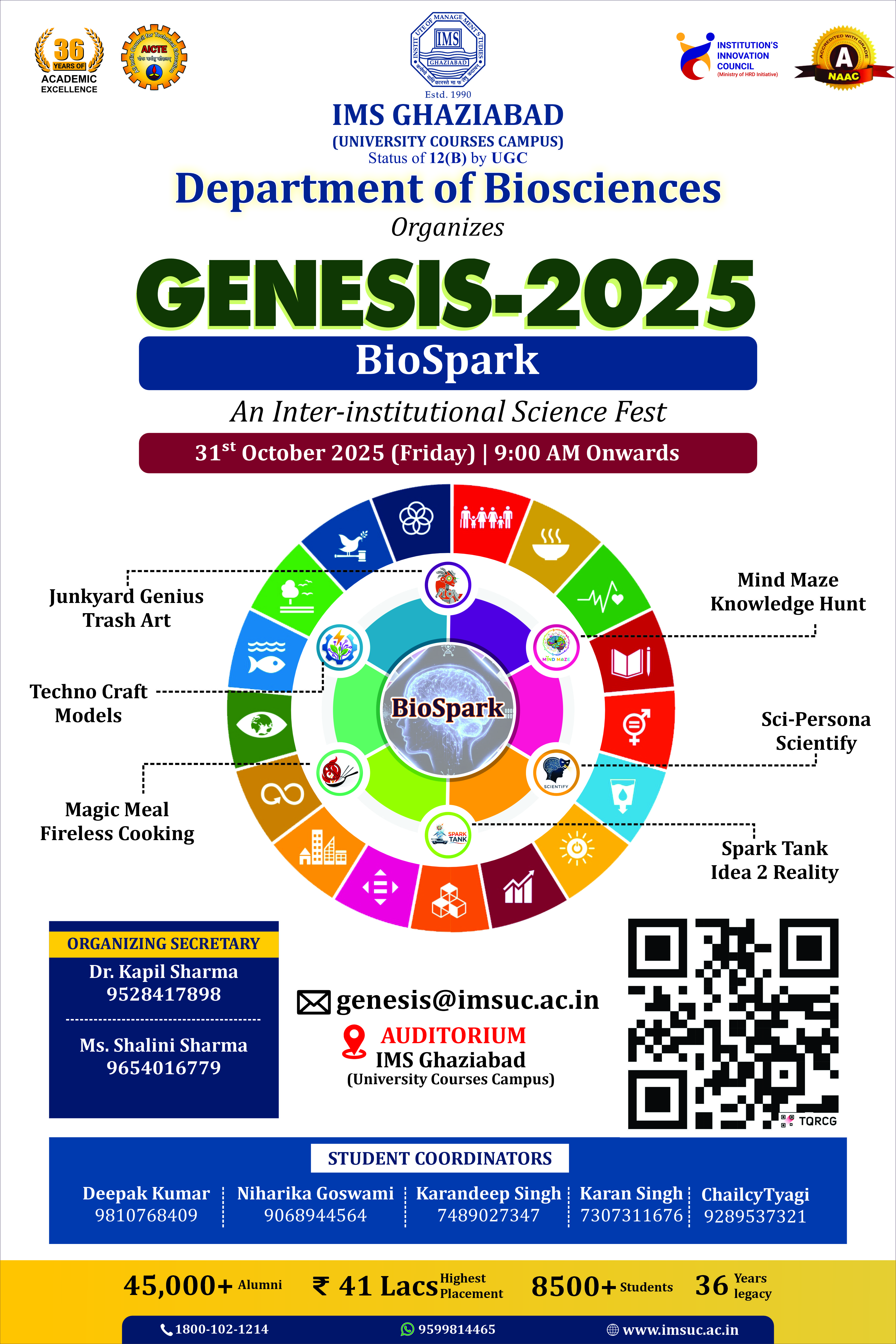 Department of Biosciences, IMS Ghaziabad (University Courses Campus) cordially invites you to participate in GENESIS-2025 Theme: BioSpark An Inter-Institutional Science Fest 31st October 2025 (Friday) | 9:00 AM onwards Auditorium, IMS Ghaziabad (University Courses Campus) Ignite your curiosity and innovation at GENESIS-2025, a celebration of science, creativity, and intellect! This year’s theme: BioSpark — embodies the spark of discovery that drives scientific exploration and sustainable innovation. Join us for an exciting lineup of events, including: Junkyard Genius :Trash Art Techno Craft :Models Magic Meal :Fireless Cooking Spark Tank :Idea 2 Reality Mind Maze :Knowledge Hunt Sci-Persona :Scientify No Registration Fees! Open to students from all schools and colleges. Register now: https://forms.gle/3RyudSyzdRSdoo5o7 Come, showcase your talent, present your innovative ideas, and experience the spirit of science and creativity at GENESIS-2025 – BioSpark! For Queries & Participation: Email: genesis@imsuc.ac.in Dr. Kapil Sharma: 9528417898 Ms. Shalini Sharma: 9654016779 Let’s celebrate the brilliance of biosciences and innovation together at BioSpark!